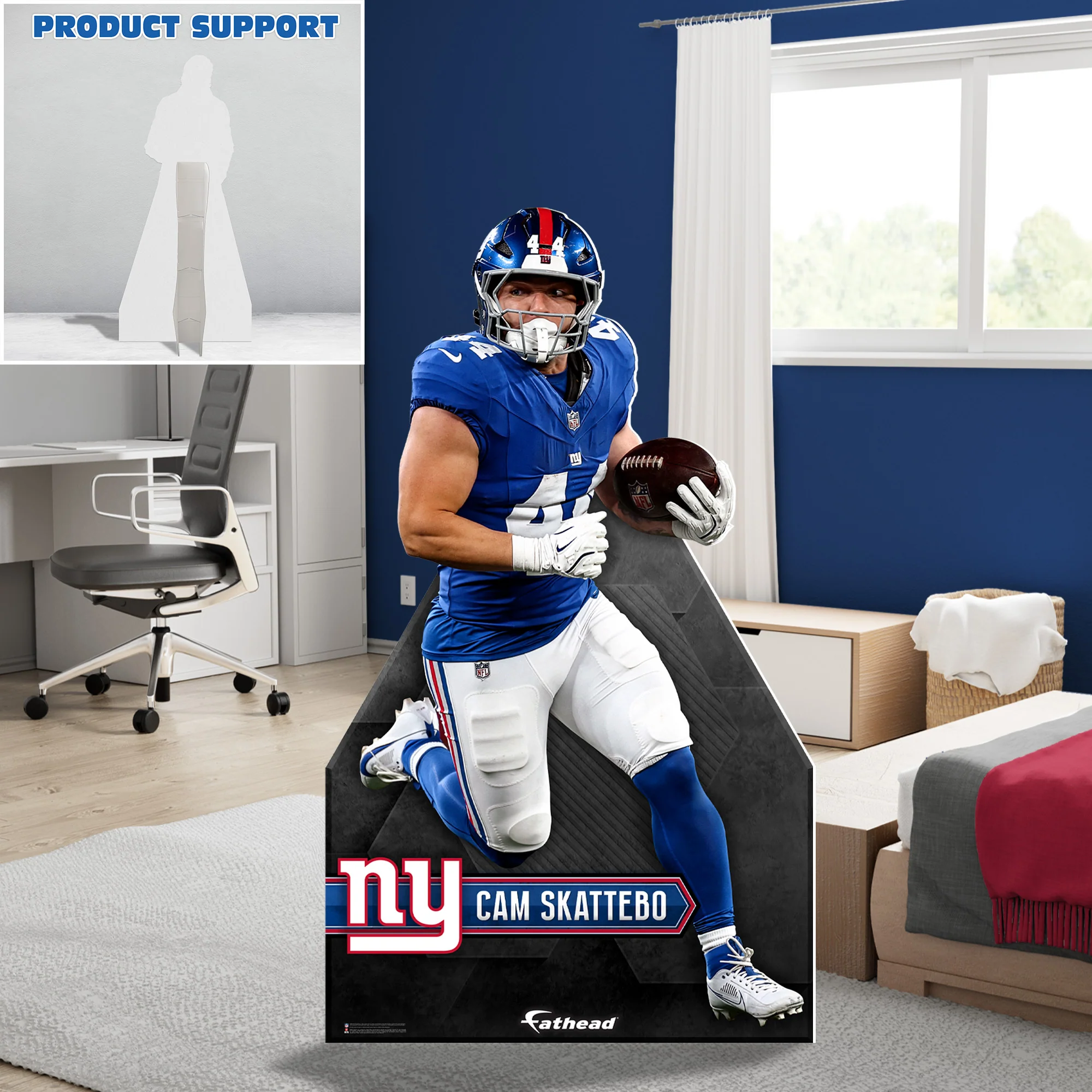 Bring the dynamic energy of Cam Skattebo into your space with this life-size Stand Out, officially licensed by the NFL and the New York Giants. Made from durable foam core, this striking cutout captures Cam in an action-packed pose, highlighting his agility and power on the field. With high-definition printing and a sturdy design, it makes a bold centerpiece for any fan space. Perfect for bedrooms, offices, or fan caves, this Stand Out lets you showcase your Giants pride with style and excitement.