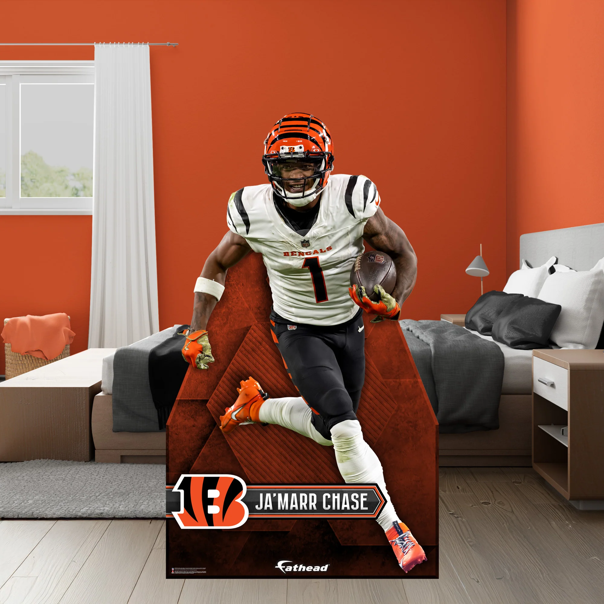 Bring the energy of the NFL into your home or office with this life-size Ja'Marr Chase Stand Out, officially licensed by the Cincinnati Bengals. Constructed from durable foam core, this vibrant cutout captures the dynamic action of Ja'Marr Chase in stunning detail, making it a striking focal point for any room. Its lightweight design and self-standing support system make it easy to set up and move, while the high-definition printing ensures bold colors and sharp details. Perfect for fans looking to showcase their team spirit, this Stand Out is a must-have addition to your Bengals collection.